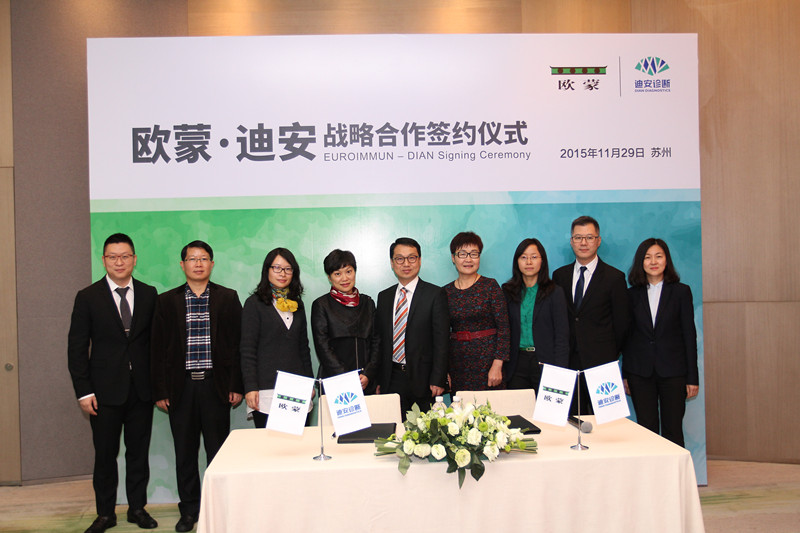 2015年11月29日,歐蒙中國(guó)集團(tuán)副總裁、歐蒙南亞及東亞集團(tuán)總裁李川先生與迪安診斷副總裁徐敏女士簽署了長(zhǎng)期戰(zhàn)略合作協(xié)議,在未來三年中,雙方將重點(diǎn)致力于建設(shè)自身免疫性疾病、感染性疾病和變態(tài)反應(yīng)性疾病的特色診斷項(xiàng)目檢測(cè)平臺(tái)。歐蒙中國(guó)以其獨(dú)特的技術(shù)優(yōu)勢(shì)、卓越的產(chǎn)品和與國(guó)際接軌的疑難樣本驗(yàn)證服務(wù)與迪安診斷完善的醫(yī)學(xué)診斷服務(wù)網(wǎng)絡(luò)、齊全的檢測(cè)項(xiàng)目技術(shù)形成優(yōu)勢(shì)互補(bǔ),雙方將共同推廣新項(xiàng)目,通過為基層醫(yī)療工作者定制的系列培訓(xùn)來提升該類特色診斷項(xiàng)目的認(rèn)知度,有效提高該類疑難病例的診斷能力與水平,從而最終造福廣大基層患者。