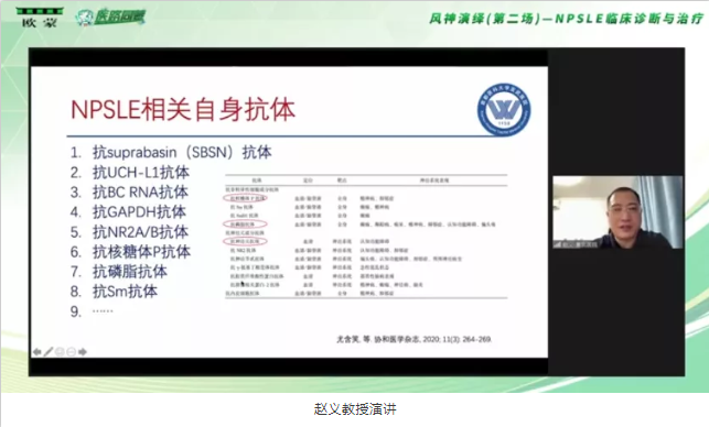 首先由首都醫科大學宣武醫院風濕免疫-變態反應科主任趙義教授給我們講解了《神經精神狼瘡的臨床診治策略》。趙義教授指出NPSLE與SLE嚴重的疾病活動性和不良預后是密切相關的。因此我們需要對NPSLE給與高度的重視。自身抗體對于NPSLE臨床表現分類、預測及評估具有一定意義。尤其是抗磷脂抗體和抗核糖體P蛋白抗體都與NPSLE有著密切的關系。關于NPSLE的診治策略,可以根據神經精神表現和狼瘡的遠近關系,有無非特異性的狼瘡精神性表現、排除狼瘡相關的干擾因素、支持神經精神狼瘡表現的因素四個方面來判斷是否為NPSLE。它的治療可以圍繞著與NP相關因素的處理、神經精神癥狀的治療、針對缺血損傷的治療、針對免疫炎癥損傷的治療這四個方面來進行。但是目前NPSLE的臨床診治方面還存在諸多問題。