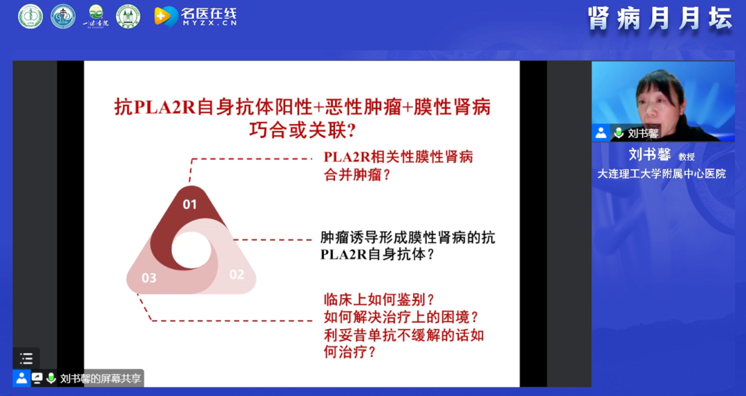 劉書馨教授分享了合并肺癌的膜性腎病病例,通過病例的分析和長期隨訪治療,詳細闡述了該患者的具體病情。劉教授也提出了疑問抗PLA2R自身抗體陽性、惡性腫瘤及膜性腎病是否是巧合還是存在關聯?惡性腫瘤相關膜性腎病的腎組織和血液循環中較少檢出PLA2R抗體,但抗PLA2R抗體陽性不能排除腫瘤繼發的膜性腎病。腫瘤可能會繼發患者的自身免疫反應,PLA2R被證明調節多種抗腫瘤和抗炎反應,包括細胞凋亡、復制活應激誘導的衰老,并且抑制細胞的轉化。關于腫瘤和膜性腎病之間是因果關系還是并發關系,劉教授也指出了有研究提出的三個確定標準:一個是惡性腫瘤經治療后膜性腎病是否緩解;其次腎病復發與惡性腫瘤復發是否同步;第三在免疫沉積物中檢測腫瘤抗原或抗腫瘤抗體。但是臨床實踐中很難應用這種標準,盡管這些標準為因果關系提供了有力證據,但缺少這些結果也并不能完全否認腫瘤的存在。劉教授最后指出,膜性腎病與腫瘤之間的關系還需要進一步的研究,因此未來需要大量的臨床病例以及更多的研究來尋找特異性抗原在血清學、腎組織中的表達、臨床意義,以及與惡性腫瘤之間的任何潛在聯系來輔助臨床決策,避免漏診誤診而導致的膜性腎病不緩解或腫瘤惡化。這對于腫瘤相關性膜性腎病患者的診斷和治療具有重要意義。
