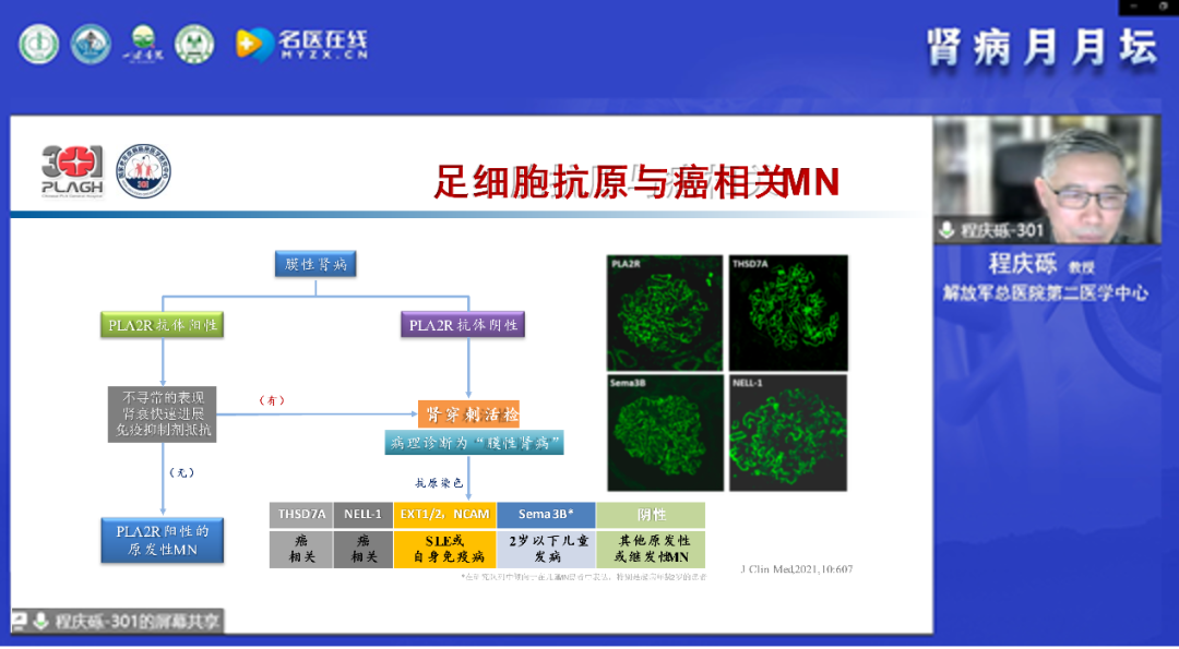 程教授提出腫瘤相關的膜性腎病也可以定義為副腫瘤性腎小球腎炎,在副腫瘤性的腎小球腎炎當中,膜性腎病應該排在第一位。關于副腫瘤性的腎小球腎炎,文獻上定義是①治療腫瘤的過程中,腫瘤緩解,腎臟病緩解;②腫瘤復發,腎臟病也復發;③也是做最重要和難度最大的,就是需要進一步探究腫瘤與MN之間內在的病理生理機制。程教授的團隊在1000多例膜性腎病的隨訪隊列中,發現了16例患者合并實體腫瘤,這其中PLA2R抗原陽性10例,NELL-1抗原陽性1例,另外5例尚未發現其他靶抗原,她們在TSHD7A抗原陽性的MN患者中沒有發現有合并腫瘤,這個結果可能和西方報道有一些差異。在中國人群當中發現NELL-1靶抗原陽性的比例超過TSHD7A抗原陽性,她們在PLA2R抗原陰性的患者中發現有35%患者NELL-1抗原是陽性,而且有一例PLA2R及NELL-1雙抗原陽性患者合并腫瘤,對于中國人群來說要進一步關注NELL-1抗原陽性的MN患者臨床病理特點及是否合并有腫瘤的高發。最后程教授談及膜性腎病合并腫瘤,可能還會牽涉到醫療安全的問題,膜性腎病高發人群都是中老年人群,患者有可能在激素免疫抑制劑治療過程當中發現了腫瘤,因此會被誤認為是治療所導致的腫瘤發生,確需對MN患者進行腫瘤的嚴密追蹤和篩查,現今醫療安全需放在首位考慮。最后程教授希望盡可能去尋找MN的致病靶抗原,不同的靶抗原可能會有不同的病理、臨床特點。