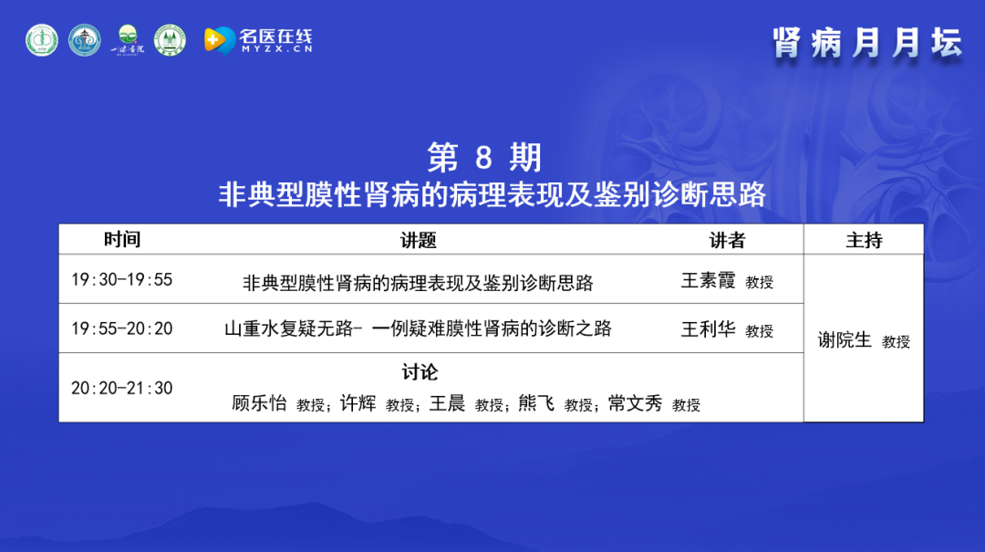 眾所周知,腎臟病患病率很高,特別是膜性腎病,在很多單位的腎活檢比率中占據第一;膜性腎病的無創診斷和治療手段日新月異;而且膜性腎病的異質性很大,很多膜性腎病的病理表現幾乎一致,但是致病原因卻不一致,診療手段應對應病因。基于此背景,“腎病月月壇”自今年5月17日以來開始舉辦,在每個月的第三周的周二晚上,每月一期,每期一個主題,已經舉辦了七期,包括“激素和免疫抑制劑在膜性腎病的合理應用”、“利妥昔單抗在膜性腎病的合理應用”、“原發性和繼發性膜性腎病的鑒別”及“中醫對膜性腎病的認識”、“膜性腎病的抗原分類及發病機制”、“膜性腎病的臨床表現、無創診斷和病理診斷”以及“膜性腎病的自發緩解和非免疫抑制治療”。今天是第8期,本期論壇的主題是“非典型膜性腎病的病理表現及鑒別診斷思路”。邀請的講者和點評、討論嘉賓都是業內非常著名的臨床專家、研究生導師、腎內科主任,具有豐富的臨床、教學和科研經驗,相信他們的分享一定會對大家的臨床診療有所幫助。
