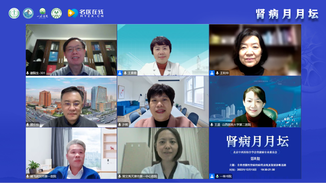 2022年12月13日,由北京中西醫結合學會腎臟病專業委員會舉辦的《腎病月月壇(第8期)——非典型膜性腎病的病理表現及鑒別診斷思路》于線上成功舉行。本次論壇由北京中西醫結合學會腎臟病專業委員會主任委員、解放軍總醫院第一醫學中心謝院生教授擔任大會主席,北京大學第一醫院王素霞教授、山西醫科大學第二醫院王利華教授作為講課嘉賓,上海交通大學醫學院附屬仁濟醫院顧樂怡教授、中南大學湘雅醫院許輝教授、山西醫科大學第二醫院王晨教授、武漢市第一醫院熊飛教授以及天津市第一中心醫院常文秀教授作為本次大會的討論嘉賓。
