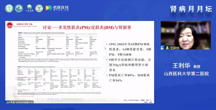王利華教授首先全面細致的分享了一例疑難膜性腎病的病例。該患者為一退休男性,主因全身浮腫伴泡沫尿1月余,于今年10月入院。該患者在體檢中發現蛋白尿,入院化驗顯示:尿常規檢測為蛋白2+,尿潛血2+,24小時尿蛋白2.27g/d,血清白蛋白37.6g/L,腎功能未見異常。一個月后雙腿水腫,病情加重入院檢查尿蛋白3+,尿隱血3+,24小時尿蛋白7.3g/d,血清白蛋白12.7g/L,血肌酐也出現異常,伴有糖尿病。該患者入院后生命體征正常,具有顏面浮腫、雙下肢中重度對稱可凹形水腫等陽性體征。同時,該患者也進行了輔助檢查包括補體、抗核抗體、血沉、甲功、腫標、彩超等。ANA強陽性,抗SmD1抗體陽性、抗U1-snRNP抗體陽性、血清補體C3降低,為明確診斷,對該患者進行了腎活檢,通過腎臟病理診斷出該患者為非典型MN,建議完善相關檢查,尋找繼發原因,足細胞有損傷,疑似腎小球微小病變,另外患者存在明顯的急性腎小管損傷。結合病理及臨床癥狀,給予相應的治療方案,目前診斷為腎病綜合征(不典型膜性腎病、系統性紅斑狼瘡性腎炎)、足細胞病是否為腎小球微小病變還有待討論,以及急性腎損傷、肺部感染(敗血癥)、結締組織病(系統性紅斑狼瘡、特發性炎癥性肌病、可能為多發性肌炎)、藥物肝損傷以及2型糖尿病。針對該病例的治療,主要采用免疫抑制劑甲潑尼龍和地塞米松(因感染而中斷),另外間斷的輸白蛋白和依諾肝素的抗凝以及保肝治療。治療過程中目前存在的主要問題為治療效果不理想以及AKI持續不緩解,激素治療后肌酸激酶升高,同時該患者免疫抑制劑使用受限。最后王利華教授針對該病例的診斷和治療提出了更多有價值的思考,包括下一步的治療方案調整,足細胞病的解釋以及是否診斷為狼瘡性疾病還是合并多發性肌炎?