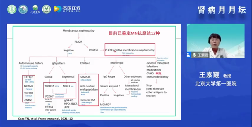王素霞教授在線分享了非典型膜性腎病診斷和鑒別診斷的思路。首先介紹了膜性腎病的基本病理特征,以及近十年來膜性腎病致病性抗原的研究有了飛速的進展,尤其在2009年Beck團隊發現了原發性MN的抗原PLA2R及血清抗體IgG4。使得對MN的認識有了飛躍的進展。王教授指出對于非典型膜性腎病的診斷,首先應當根據其病理表現進行初步的判斷。繼發性MN常表現為不典型MN,光鏡檢查、免疫熒光、IgG亞型-輕鏈、抗原檢測和電鏡檢查等有助于典型與非典型MN的鑒別診斷。多種病因可導致繼發性膜性腎病,青年人應排除外感染、自身免疫病、藥物、毒物(汞)等相關MN;老年人注意排除外腫瘤相關MN。腫瘤相關MN的抗原種類包括NELL-1,IgG亞型以IgG1為主,第二位與腫瘤相關的MN抗原為THSD7A,也有相關文獻表明極少數腫瘤相關MN也可表達PLA2R。王教授還指出不同致病性抗原的檢測有助于繼發性MN的病因學診斷,MN為一類病理形態相似的損傷模式,推薦基于抗原與繼發性疾病相結合的MN新分類,將為臨床治療與發病機制探討提供重要依據。