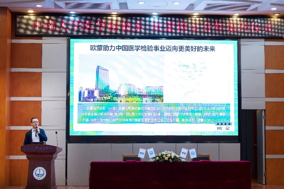 湘雅三醫院副院長曹科教授在致辭中對歐蒙多年來為檢驗醫學事業、專業人才建設所做出的貢獻給予了充分肯定,感謝歐蒙多年來對于湘雅人才培養的大力支持。這次戰略合作既加深了歐蒙與湘雅的友誼,又進一步豐富了教學資源。未來雙方將充分發揮各自優勢,全面打造“產、學、研、用、教”鏈條式發展,攜手促進未來人才培養,為行業輸送更多高精尖的專業人才。