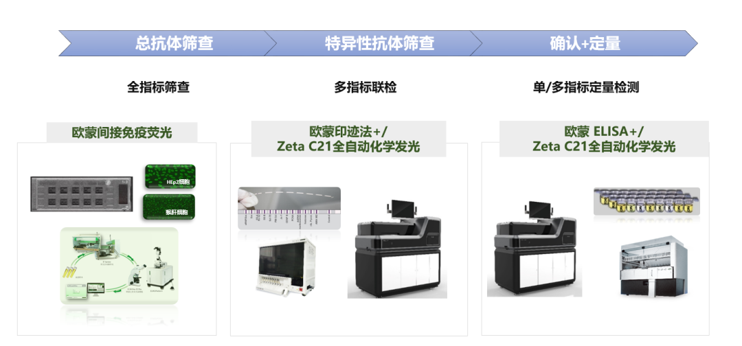 歐蒙在自身抗體檢測方面,方法學齊全,自動化程度也非常高,除了擁有經典的IIF、ELISA及歐蒙印跡法之外,歐蒙近兩年又重磅推出了ZETA C21全自動化學發光檢測系統。截至目前,用于ZETA C21檢測系統的試劑項目越來越多,主要包括ANA 15項、ANCA 3項及抗磷脂抗體8項等,可以滿足不同患者的診療需求。