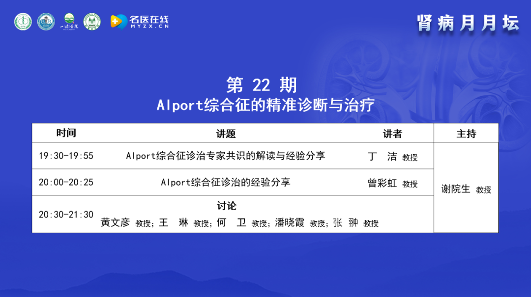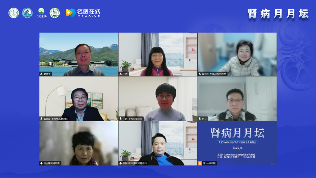 謝教授簡單介紹了“腎病月月壇”的歷史,“腎病月月壇”是在2022年5月疫情防控期間開始的線上學術交流活動,每個月第3周的周二晚上19:30-21:30開展,其形式是講座與討論相結合;論壇內容以臨床問題和臨床需求為導向,通過中醫和西醫的結合、腎科和其他學科的結合,以期提升腎臟病相關領域的診療水平。本期討論和交流的主要內容是Alport綜合征的精準診斷與治療,邀請的講者和討論嘉賓都是在該領域有很深造詣的專家,相信能為大家帶來有價值的內容。
