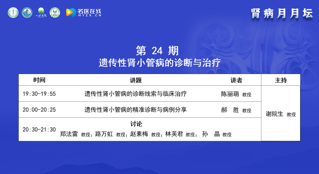 謝教授簡單介紹了“腎病月月壇”的歷史,“腎病月月壇”是在2022年5月開始舉辦的線上學(xué)術(shù)交流活動,迄今為止正好兩年時間,24個月共舉辦了24期,每月一期,每一期都是在每月第3周的周二晚上19:30-21:30開展,形式是講座與討論相結(jié)合。“腎病月月壇”最開始議題聚焦在膜性腎病,后來逐漸延展至多器官損害、新冠相關(guān)的多系統(tǒng)損害及風(fēng)濕性疾病的腎臟損害等,今年以遺傳性腎病為主,今天的主題是遺傳性腎小管病的診斷與治療,邀請了在該領(lǐng)域臨床及研究方面有很深造詣的專家進(jìn)行交流。