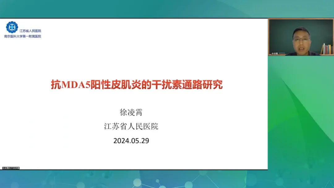 徐凌霄博士首先介紹了MDA5陽性皮肌炎的臨床癥狀及基因調(diào)控機(jī)制,MDA5陽性皮肌炎是一種常見的自身免疫性疾病,表現(xiàn)為皮疹、潰瘍、瘢痕性脫發(fā)、鈣質(zhì)沉積等。還詳細(xì)介紹了MDA5基因結(jié)構(gòu),蛋白結(jié)構(gòu)域及功能域,MDA5+皮肌炎與RP的合并,使得治療抵抗差,死亡率高。此外,MDA5+皮肌炎還可能與中性粒細(xì)胞、單核細(xì)胞等亞群細(xì)胞的高表達(dá)有關(guān),其過渡或過度激活可能與干擾素通路密切相關(guān)。