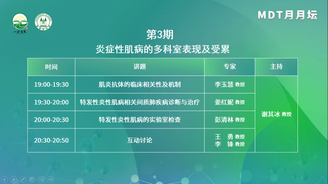 2023年7月18日(周二),由一味書院主辦的《MDT月月壇(第3期)—炎癥性肌病的多科室表現(xiàn)及受累》于線上成功舉行。本次論壇由四川大學(xué)華西醫(yī)院風(fēng)濕免疫科主任謝其冰教授擔(dān)任大會主席,北京大學(xué)人民醫(yī)院李玉慧教授、復(fù)旦大學(xué)附屬中山醫(yī)院廈門醫(yī)院姜紅妮教授、中日友好醫(yī)院彭清林教授作為講課嘉賓,陸軍軍醫(yī)大學(xué)西南醫(yī)院王勇教授、寧夏醫(yī)科大學(xué)總醫(yī)院李鋒教授作為本次大會的討論嘉賓。