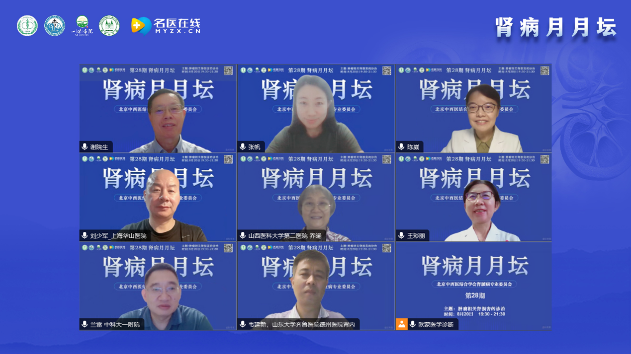 2024年8月20日,由北京中西醫結合學會腎臟病專業委員會舉辦的《腎病月月壇(第28期)——腫瘤相關腎損害的診治》于線上成功舉行。本次論壇由北京中西醫結合學會腎臟病專業委員會主任委員、北京中西醫結合腎臟疑難病會診中心主任、北京大學航天中心醫院腎內科主任醫師特聘教授、解放軍總醫院及南開大學醫學院博士生導師謝院生教授擔任大會主席,中山大學附屬第一醫院陳崴教授、解放軍總醫院張帆教授作為講課嘉賓,復旦大學附屬華山醫院劉少軍教授、山西醫科大學第二附屬醫院喬晞教授、包頭醫學院第一附屬醫院王彩麗教授、中國科學技術大學附屬第一醫院(安徽省立醫院)蘭雷教授以及山東大學齊魯醫院德州醫院韋建新教授作為本次大會的討論嘉賓。