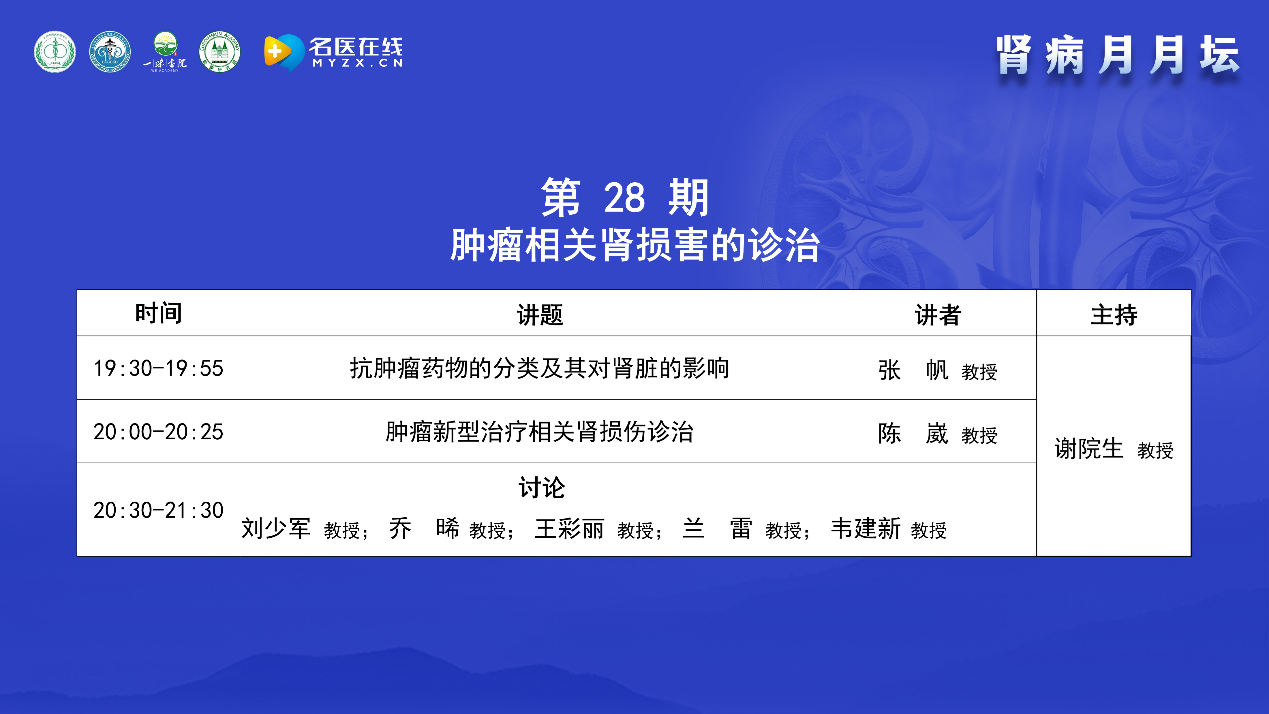今天的主題是腫瘤相關腎損害的診治,很榮幸邀請到了在該領域有很深造詣的專家,一起進行學術講座、點評與討論。