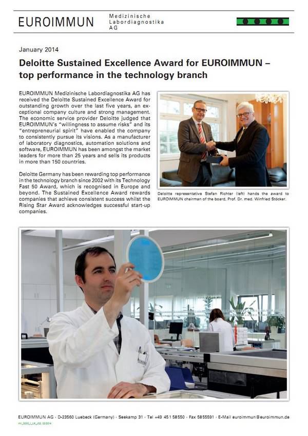 德勤咨詢公司(Deloitte Consulting)日前授予歐蒙醫學實驗診斷股份有限公司持續杰出表現獎(Sustained Excellence Award)。憑借過去五年里驚人的業績增長、獨特的企業文化以及高效的管理制度,歐蒙從眾多競爭對手中脫穎而出,獲得認可。德勤咨詢公司評價到:歐蒙公司勇于迎接挑戰的決心和創業精神使得該公司可以不斷追求自己的企業愿景。作為一家集實驗室診斷、自動化解決方案和軟件于一身的制造商,歐蒙在過去二十五年間一直是市場領軍人,公司產品銷往150多個國家。
